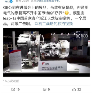 11月3日,微博ID@机工战略发布一则视频称,“GE公司(美国通用电气公司)在进博会上的展品;虽然有贸易战,但通用电气的康复离不开中国市场的‘疗养’。模型由leap-1a中国首家客户浙江长龙航空提供 ,一个展品,两家广告啊。”