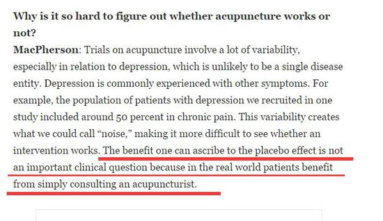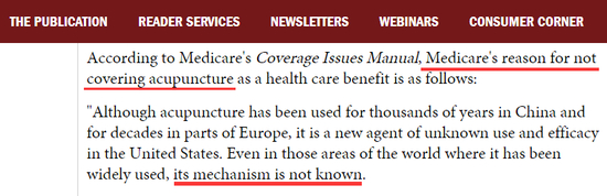而美国一家专门关注针灸发展的网站“今日针灸”(AcupunctureToday.com)则介绍说,其实早在2003年时,美国的医保机构就评估过把针灸纳入美国医保的可能性,但最终未能通过,其原因正是“机理不明确”……