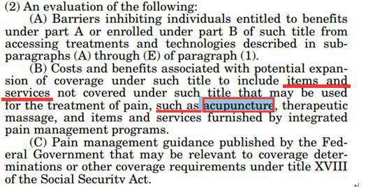 那么在这一大前提下,法案进一步提出了要[评估]针灸和保健按摩等一系列潜在可代替鸦片类药物的止痛服务。