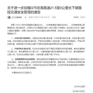 新京报快讯 据兰州交警指挥中心官方微博消息,根据《中华人民共和国道路交通安全法》、《甘肃省道路交通安全条例》、《甘肃省高速公路管理条例》等法律法规,为预防G75兰海高速公路21.5至0公里长下坡路段(临洮至兰州方向)重特大道路交通事故,保障人民生命财产安全和道路交通有序畅通,现就进一步加强该路段交通安全管理通告如下: