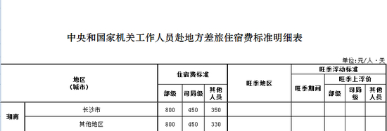 财政部的这份明细表,对中央和国家机关的部级官员、司局级官员赴地方出差的住宿标准进行了明确的规定。
