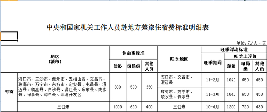 去海南省出差也要分地区来看,到三亚出差,住宿标准是1000元/天,在10月至4月旺季期间,上浮到1200元/天。如果是去海南其他地方出差,部级领导的住宿标准则变为了800元/天。