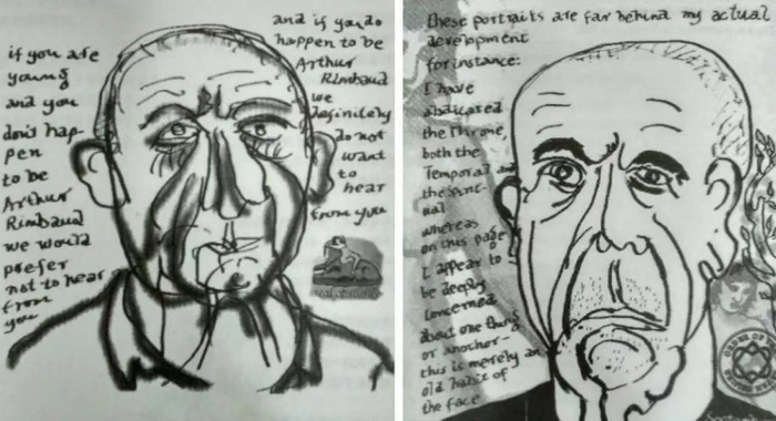 科恩的自画像。第一幅所配文字是:“如果你还年轻,而且碰巧你不是阿尔蒂尔·兰波,那么我们宁愿不要听到你的消息。如果碰巧你是亚瑟·兰波,我们就坚决不想听到你的消息。沉默之印。”(来自《渴望之书》)