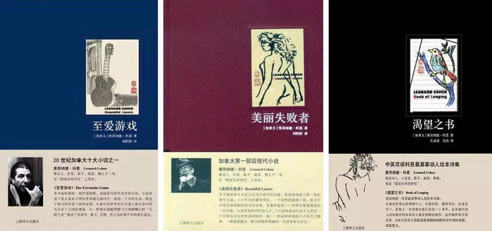 莱昂纳德·科恩的绝大多数作品目前还没有中译本,近年来正式出版的中译本只有两部小说《至爱游戏》(The Favourite Game,2014年上海译文出中译本,译者: 刘衎衎)和《美丽失败者》(Beautiful Losers,早期译本名为《大大方方的输家》,2012年上海译文出新译本,译者: 刘衎衎),以及他的晚年诗集《渴望之书》(Book of Longing,2011年上海译文出,由孔亚雷和北岛翻译)。