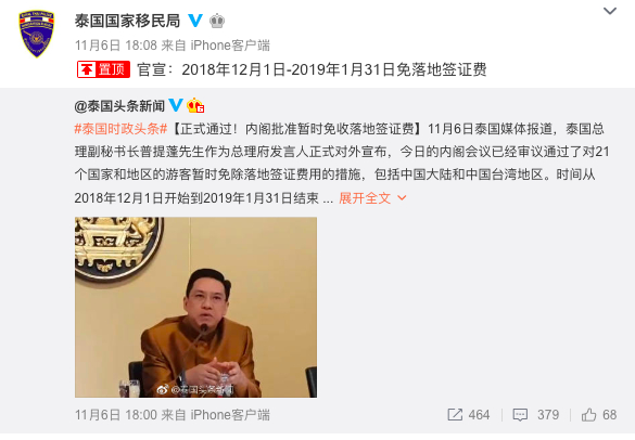 半个月后的11月6日,泰国总理副秘书长普提蓬作为总理府发言人正式对外宣布:泰国内阁会议审议通过了对21个国家和地区的游客暂时免除落地签证费用的措施,包括中国大陆和中国台湾地区。