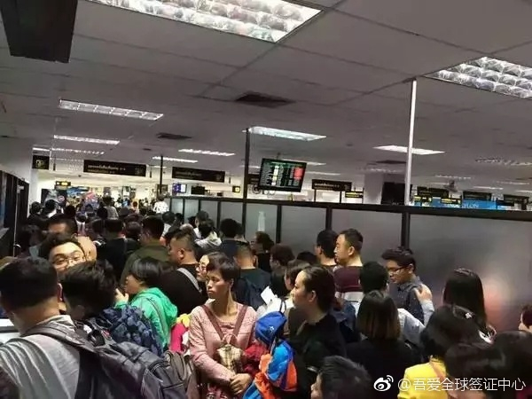 2017年12月赴泰中国游客在办理落地签证处排队等候。 图片来源/吾爱全球签证中心微博