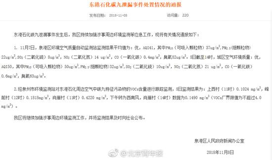 福建泉港碳九泄漏 官方:空气质量监测平均值为优
