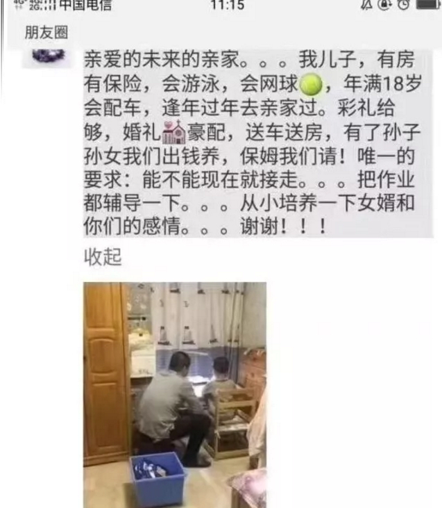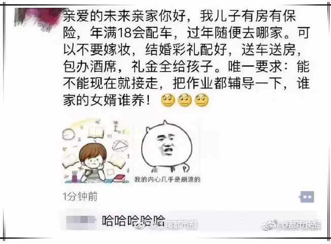 这些心急的“老丈人”们多半承诺有车有房,豪华嫁妆,不要彩礼,酒席帮忙——可谓是现代婚恋市场中的“顶配”,真是展露自己为娃护航的雄厚财力呢。