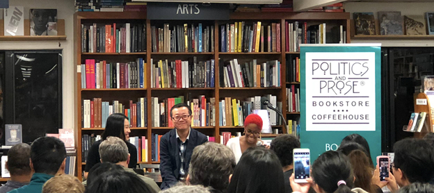 作为刘慈欣访美行程的一部分,在领奖后的第二天晚上7点,刘慈欣在美国华盛顿特区的政治与散文(Politics and Prose)书店,和《华盛顿邮报》科幻小说书评编辑伊夫狄恩·梅森(Everdeen Mason)举行了对谈。伊夫狄恩·梅森本身是一个科幻迷,她每个月都会在《华盛顿邮报》的科幻专栏上,点评这个月新出的科幻小说。他们广泛地交流了对女性的看法、东西方的科幻小说的异同、科技与文学的关系还有对人类未来的看法。刘慈欣也透露了他对他笔下人物的看法,以及对人类沉溺于信息技术的担忧。