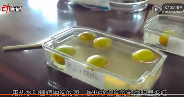 实验过程:在容器中放入约20克糖精钠,随后注入400毫升、70℃的热水,搅拌待糖精钠溶解后,将5颗表皮全为绿色的青枣放入水中,静置1小时,每隔15分钟观察枣表皮颜色变化。