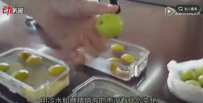 实验过程:在透明容器中放入约20克糖精钠,随后注入约400毫升自来水(常温),搅拌溶解后,将4颗青枣放入水中静置1小时,期间每隔15分钟观察枣皮表面颜色变化。