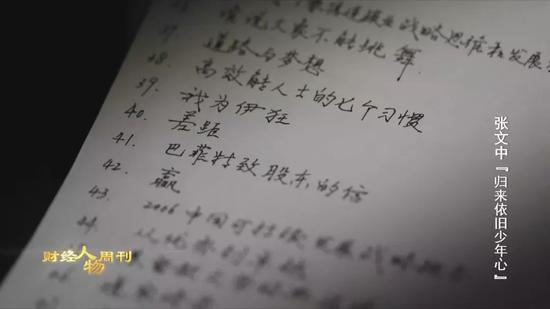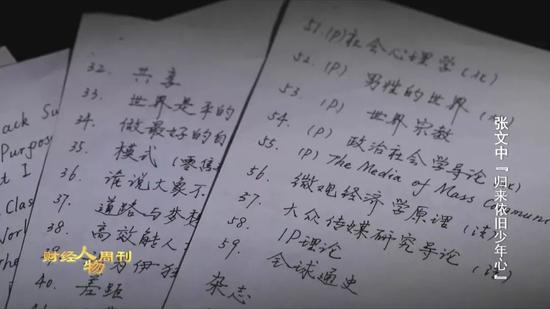 在失去自由的最初日子里,张文中说,他也消沉迷茫过,但是很快,他就找到了一条能让自己再次站起来的路。原来,张文中在监狱中给自己列出了一个长长的书单。