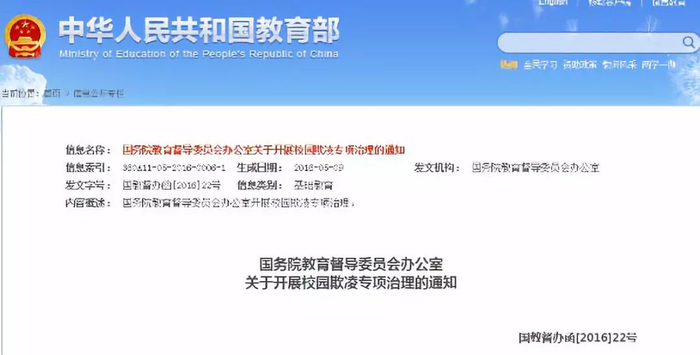 2017年11月,教育部、团中央等11部门印发了《加强中小学生欺凌综合治理方案》,更加明确了校园欺凌的界定,并针对学生欺凌的不同情形,制定了不同的惩戒措施。