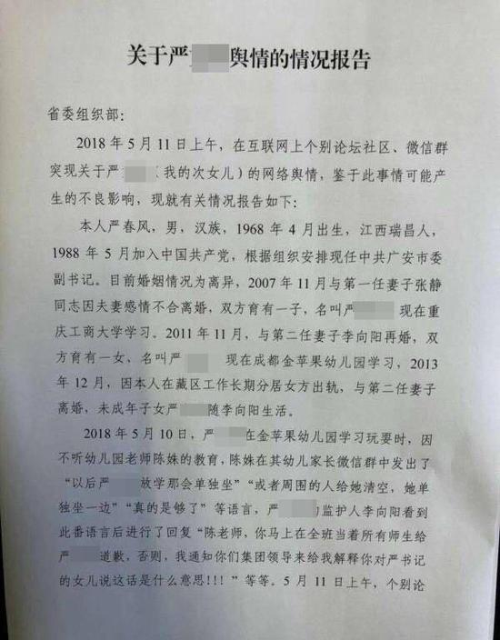 这份日期为5月11日的情况报告称,严春风目前的婚姻状况为离异,2007年11月与第一任妻子因夫妻感情不合离婚,双方育有一子,现在重庆工商大学学习。2011年11月,与第二任妻子李向阳再婚,双方育有一女,即在金苹果爱弥儿幼稚园(南区)就读的严某某,2013年12月两人离婚,严某某随李向阳生活。