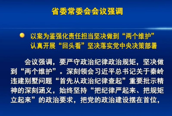 会议指出,党中央彻底查清陕西秦岭北麓西安境内违建别墅问题,对涉及的相关党组织和党员干部作出严肃处理,充分体现了以习近平同志为核心的党中央把政治建设摆在首位、坚决推进全面从严治党的鲜明态度,充分彰显了我们党坚决反对腐败、以零容忍态度惩治腐败的坚定决心,释放了正风反腐力度不减、节奏不变的强烈信号。全省各地各部门要认真学习贯彻,举一反三、引以为戒,严守政治纪律、政治规矩,牢固树立“四个意识”,坚决做到“两个维护”,以实际行动践行对党绝对忠诚。要旗帜鲜明讲政治,切实把党的政治建设摆在首位,把坚决贯彻落实习近平总书记重要指示批示和党中央决策部署作为重要政治责任、领导责任、工作责任,确保政令畅通、令行禁止。