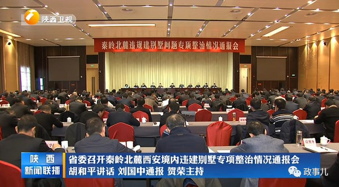 11月15日,秦岭北麓西安境内违建别墅专项整治情况通报会在西安召开。陕西省委书记胡和平出席并讲话。省长刘国中通报秦岭北麓西安境内违建别墅专项整治工作情况。省委副书记贺荣主持。省委常委、省委组织部部长张广智通报省委常委班子专题民主生活会情况,省委常委、省纪委书记王兴宁通报专项整治案件查处情况。省委常委梁桂、王永康、庄长兴、姜锋、牛一兵出席。省人大常委会副主任,省政府副省长,省政协副主席,省军区、省法院、省检察院、武警陕西省总队等有关领导同志出席。