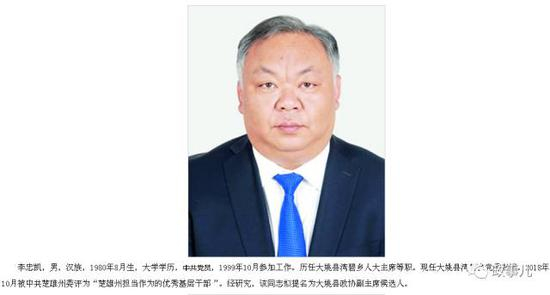 公示称,李忠凯大学学历,中共党员,1999年10月参加工作。历任大姚县湾碧乡人大主席等职。2018年10月被中共楚雄州委评为“楚雄州担当作为的优秀基层干部”。