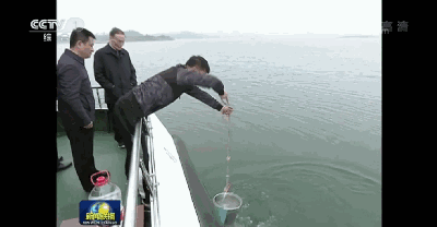 根据电视画面,当时船上的随行人员,把一个桶扔进丹江口水库中,打上来一桶水。之后工作人员舀出一瓢,倒入一个玻璃杯中,递给王岐山。