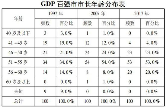GDP百强市市长的平均年龄呈现升高趋势, 大多数市长的年龄区间为51-55岁;青年 (40岁以下) 和老年 (60岁以上) 群体几乎没有, 集中趋势愈来愈明显。这一现象可以从两个层面来进行分析。