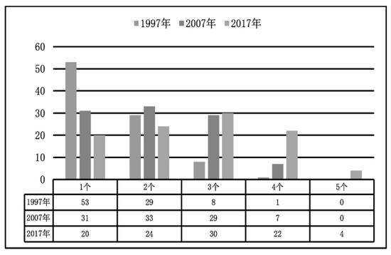 此外, 百强市市长拥有1类以上专业背景的市长从1997年的15.9%增长到2017年的47%, 复合专业背景人才日益增多。