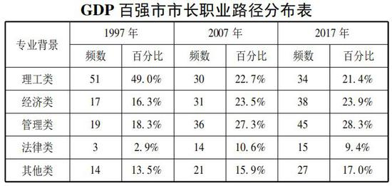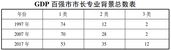 1997年、2007年及2017年的数据显示, GDP百强市市长的专业背景呈现出两个主要变化规律:第一, 从以理工科为主到人文社科为主;第二, 由单一专业背景到多元专业背景。