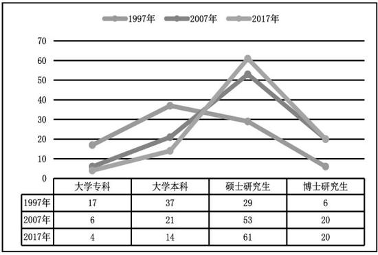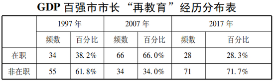 从1997年到2017年, 拥有本科及以下学历的GDP百强市市长从59.3%下降到18%, 拥有硕博学历的市长从39.3%增长到81.8%, 学历水平不断提高。