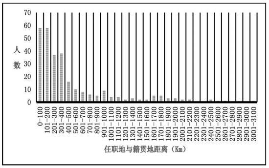 为了进一步分析, 笔者将GDP百强市分布图与百强市市长籍贯分布图进行叠加, 并计算籍贯地与任职地之间的距离, 发现400公里以内的距离占多数, 大致相隔1至2个地级市, 说明中央偏向于将市长安排到省内其他地级市任职, 既保证了市长对任地风土民情的熟知, 又降低了因地缘关系而导致的权力寻租风险。