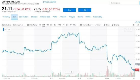 刘强东缄默80天后的首次发声貌似没有对京东的股价产生太大的帮助,19日周一京东开盘跌了约2.6%,后跌幅迅速扩大,最终收盘跌8.42%,收报21.10美元,创2016年7月8日以来新低↓↓