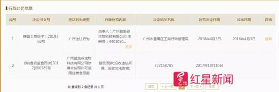 红星新闻记者在国家企业信用信息公示系统查到,广州益生谷生物科技有限公司分别于2017年10月、2018年4月受到两次行政处罚。其中,2017年10月,该公司涉嫌未按照许可范围经营食品被处罚。2018年4月,公司因广告违法被广州市番禺区工商行政管理局责令停止违法行为,罚款4.5万元。