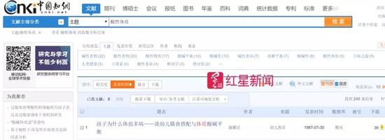 在中国知识基础设施工程“中国知网”以“酸性体质”作为主题关键词检索,最早的一篇有关人体体质分酸碱,需注意酸碱性食物摄入的文章出现在1987年。这篇名为《孩子为什么体弱多病——谈幼儿膳食搭配与体质酸碱平衡》的文章,刊载于期刊《幼儿教育》,在文中作者表示,“有关资料表明,由于人类受饮食习惯的影响,酸性体质者较多,而70%的疾病发生在酸性体质。”