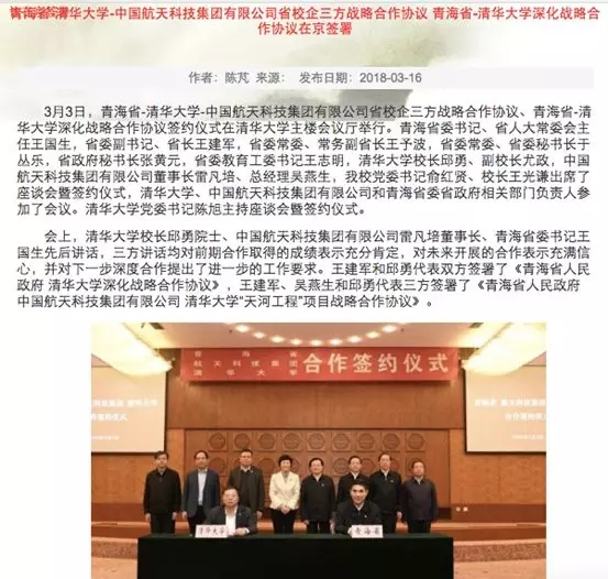 青海省-清华大学-中国航天科技集团三方为“天河工程”项目签订战略协议。