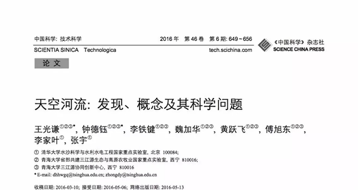2016年5月,青海大学校长、中科院院士王光谦带领的团队在《中国科学:技术科学》上发表题为《天空河流: 发现、概念及其科学问题》,正式提出“天空河流(River in the Sky)”及其简称“天河(Sky River)”的概念。