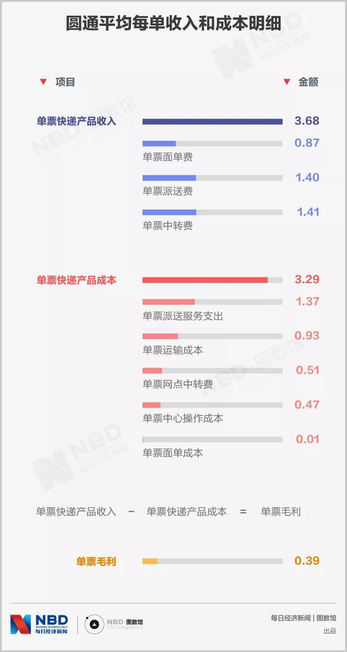 具体到每一单快递,2017年圆通平均每单收入为3.68元,单票快递产品成本3.29元,单票毛利0.39元,相比2016年的0.47元下降了近20%。
