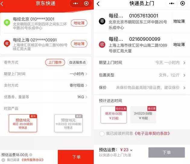 一件1kg的物品,从每日经济新闻北京新闻中心寄到上海新闻中心,京东快递预估价为18元,次日20点前到。顺丰预估价为23元起,次日18点前到。
