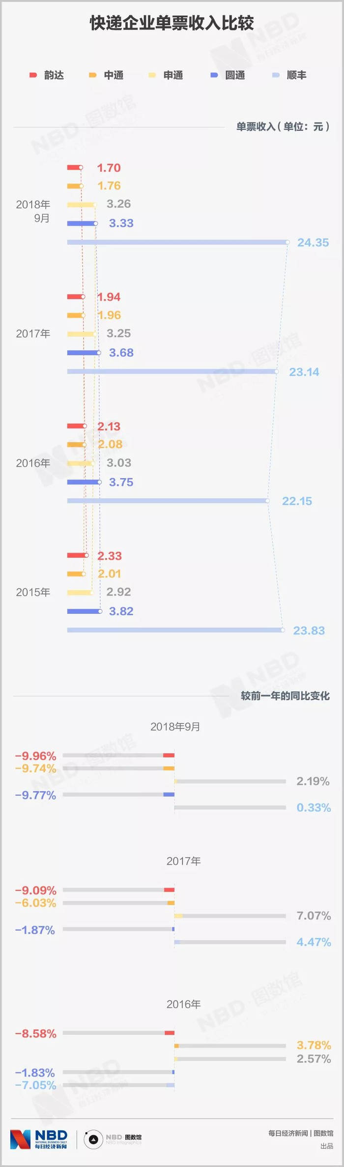 其中,韵达的单票收入最低,但其业务量大。今年9月份,韵达日均业务量突破2000万件大关,成为继中通之后第二家日均业务量跨过2000万门槛的快递企业。