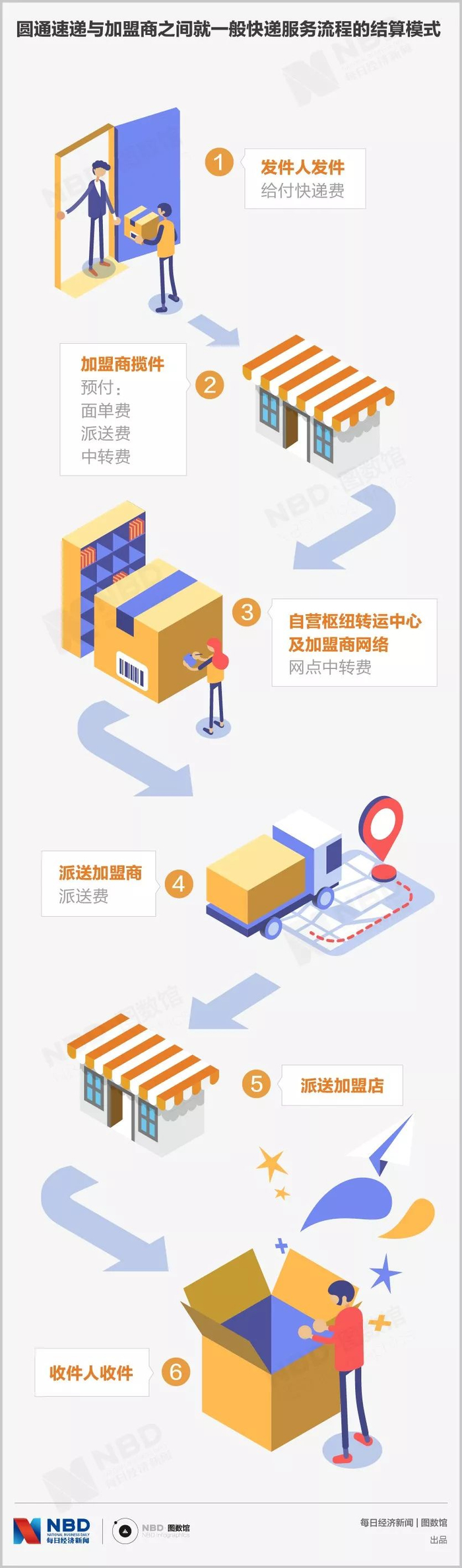 加盟模式下(韵达、申通、圆通、中通),一单快递从收件到派件,总共经过“三道关”:揽件加盟商、总部干线、派件加盟商。三道关口之间没有隶属关系,每单快递从上一环节到下一环节都需要付费。