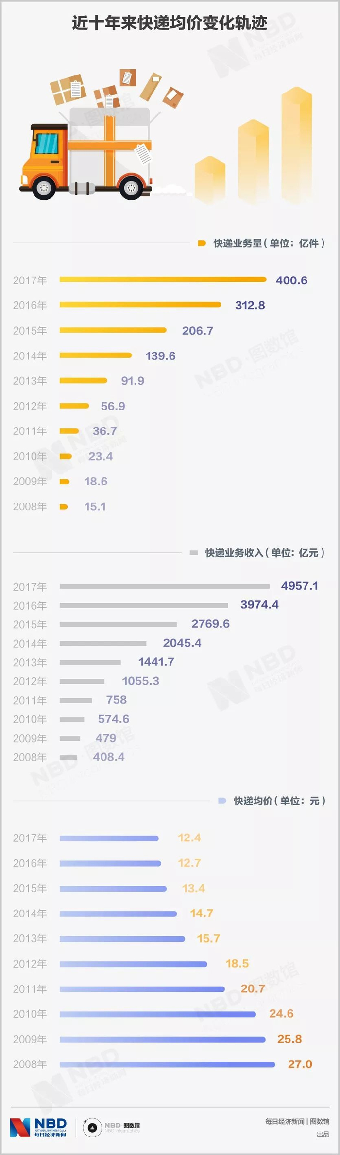 国家邮政局的统计数显示,2008年快递平均单价约27元,到2018年10月,平均单价已降至11.4元。