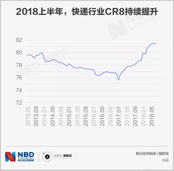 随着行业竞争的加剧,快递品牌集中度持续提升。截至今年上半年,行业CR8(前8大企业的市场份额总和)提升至81.5%,而2017年底,该值为78.7%。新进入者及小型快递企业越来越难以在竞争中生存。