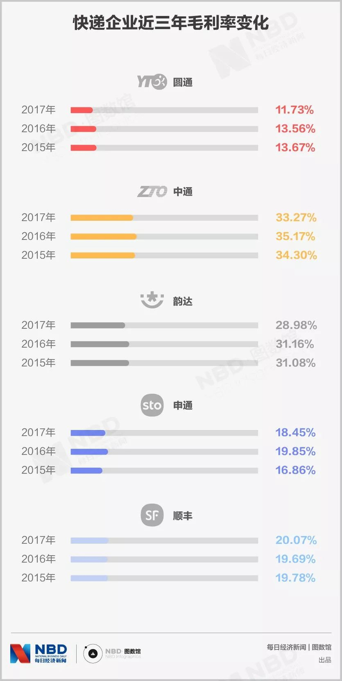 各快递公司虽然业务量在上升,收入在上升,但是除顺丰外,其他快递公司的毛利率同比均在下降。