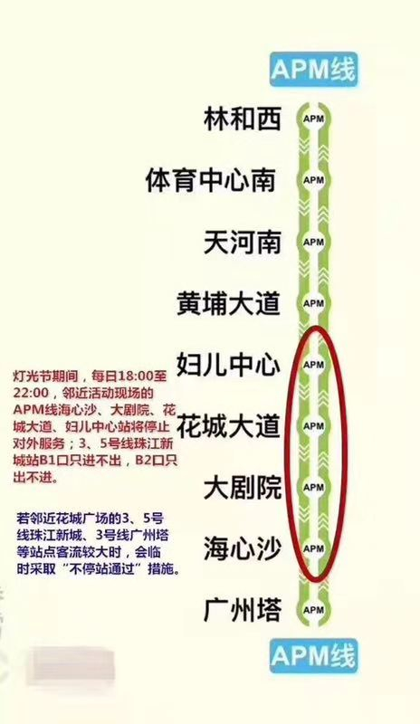 另外,灯光节期间,邻近活动花城广场主会场的APM线海心沙、大剧院、花城大道、妇儿中心站将停止对外服务;3、5号线珠江新城站B1口只进不出,B2口只出不进。若邻近花城广场的3号线、5号线珠江新城、3号线广州塔等站点客流较大时,会临时采取“不停站通过”措施。