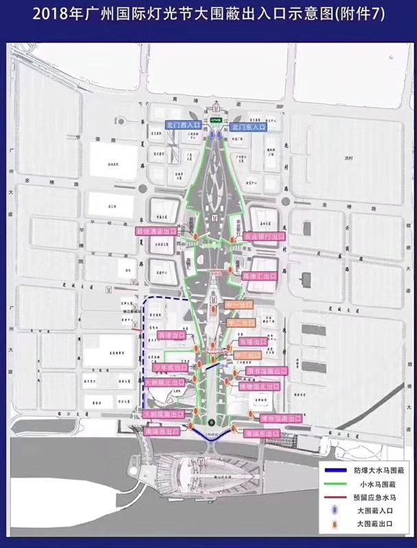 围蔽方案显示,灯光节期间,花城广场主体将用小水马进行全面围蔽,外围还将用防爆大水马围蔽,仅在花城广场北侧的黄埔大道设两个入口,从花城广场地铁站通往花城广场的地下通道也将只进不出,所以大家不要从珠江新城地铁站、华夏路、花城大道及临江大道附近进入花城广场!