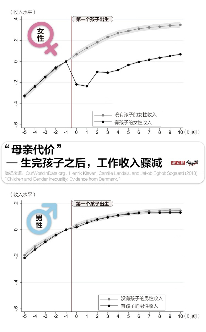 根据丹麦一项对准父母们长达33年 (1980-2013年) 的跟踪研究,女性生完第一个孩子以后,收入会骤减,并且很难再恢复到之前的收入水平,而孩子爸爸的收入却不会受到孩子出生的影响。这种情况被称为“母亲代价”。