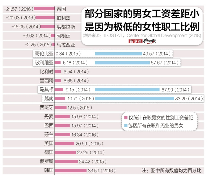 关键就在于女性参与工作的比例。由于在计算性别工资差距时,主要国际组织(包括OECD、国际劳工组织以及世界银行)仅统计了在职员工的工资,忽略了没有工作的女性群体,因此,女性在职场中可能遭遇的不平等并没有真正体现。
