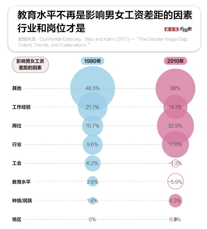 美国有研究显示,与1980年相比,由于女性整体受教育水平的提高,学历不再是导致性别工资差距的因素,反而极大地帮助女性获得更好的工作。此外,随着女性参加工作的比例越来越高,工作经验对男女工资差距的影响也越来越小。然而,行业和工作岗位的影响却在不断扩大。