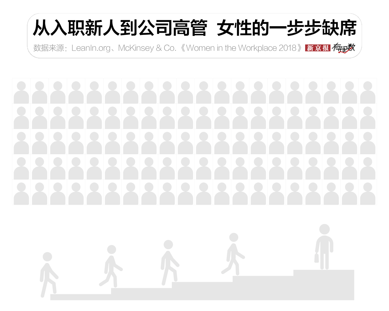 2012年,国际女性公益组织“向前进”和麦肯锡咨询公司开始发布年度女性工作报告。在最新的《女性工作报告2018》中,该组织收集了来自全球279家公司,超过1300万员工的职场数据。《报告》发现,随着职位的升高,女性的缺席越来越严重。