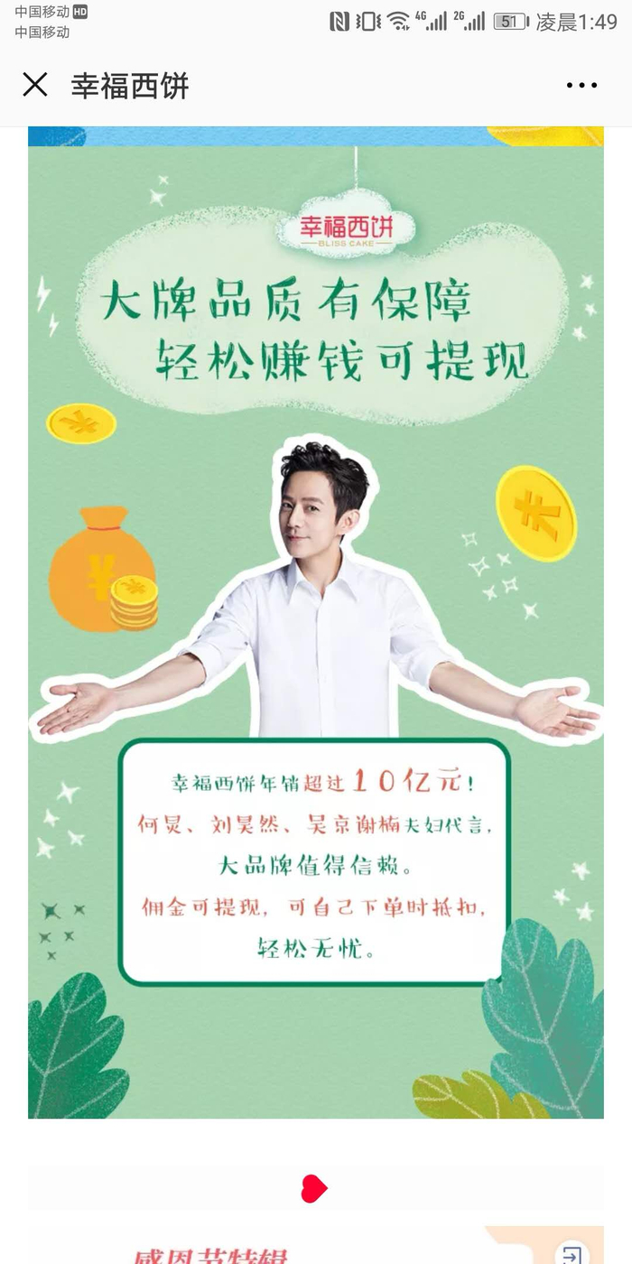 公开资料显示,幸福西饼2008年成立,最初定位为线下烘焙连锁品牌,2013年转型为O2O蛋糕模式,并于2017年、2018年先后签约知名主持人何炅、演员刘昊然成为其代言人。何炅的幸福西饼广告里显示有“大牌品质有保障,轻松赚钱可提现”。刘昊然的广告则称“我的专属蛋糕,只在幸福西饼”。