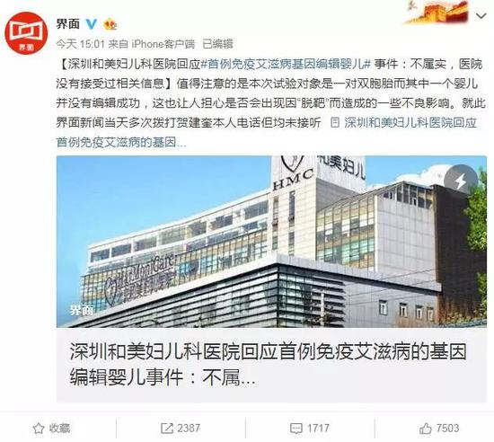 不过深圳和美妇儿科医院11月26日下午对界面新闻记者回应称“这件事不属实,我们没有接受过相关信息,不知道这件事为什么会上热搜,正在调查。”而至于贺建奎是否有挂靠深圳和美进行相关研究,深圳和美方面表示“不了解情况”。