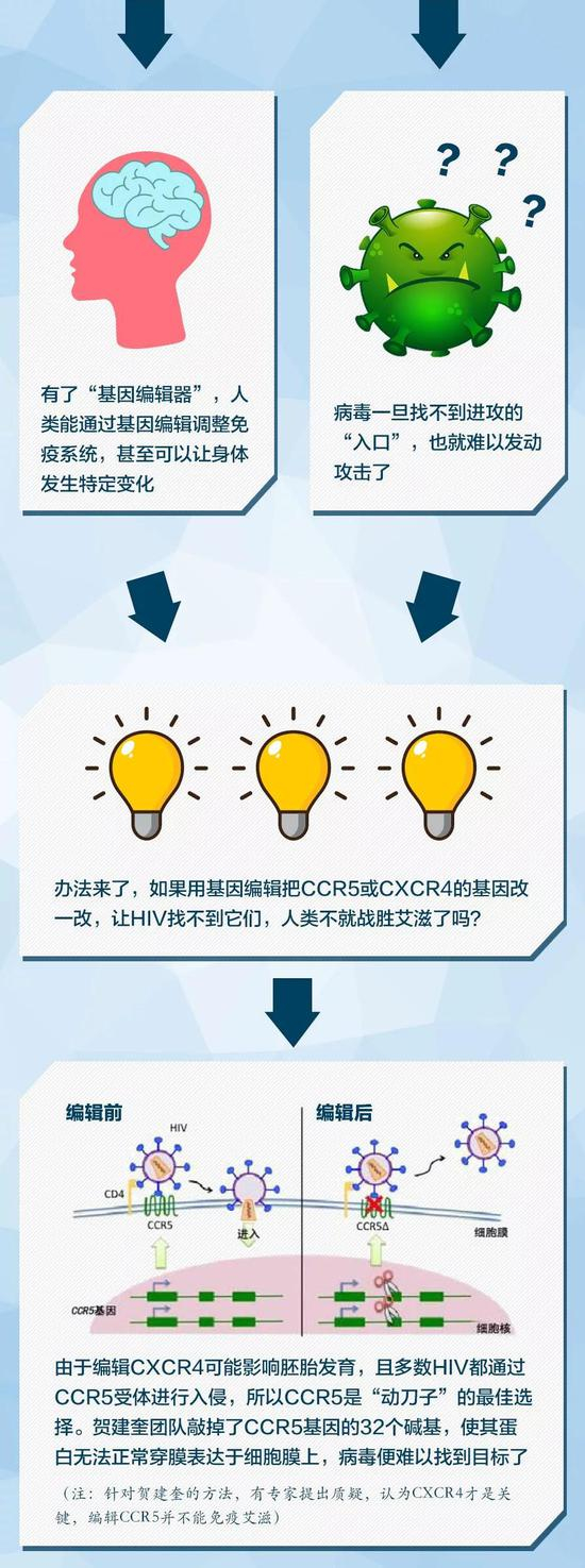 虽然事件本身在网络上引起热烈讨论,但很多网友对基因编辑的原理或许并不熟悉。基因编辑抵抗艾滋病究竟是如何实现的?为什么伦理问题如此受到关注?在遥远的未来,基因编辑能为人类的生活作出贡献吗?看完下面这张图,你就了解了。