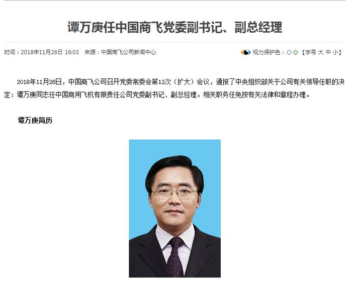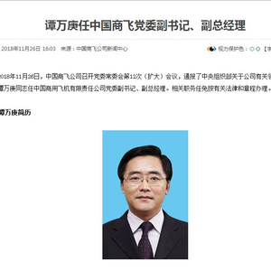 据中国商飞公司官网消息,11月26日,谭万庚任中国商用飞机有限责任公司党委副书记、副总经理,谭万庚此人,是中国南航的“老人”。