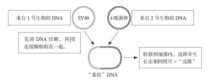 1970 年冬季,伯格与戴维·杰克逊开始了他们首次剪切与拼接两段DNA 的尝试。尽管面临着各种难以想象的技术障碍,但他们还是成功地将外源基因片段连接到完整的SV40 基因组上,其中就包括一段来自细菌病毒